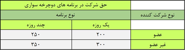 * مبلغ حق شرکت در برنامه ها برای عضو و غیر عضو متفاوت بوده و اعضا مبلغ کمتری پرداخت خواهند کرد. جدول مبلغ حق شرکت در برنامه ها به شرح زیر است (تمام مبالغ به تومان می باشد) :